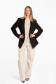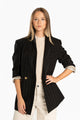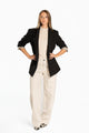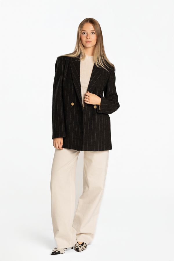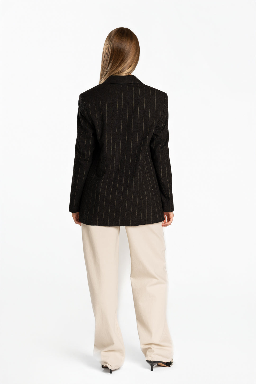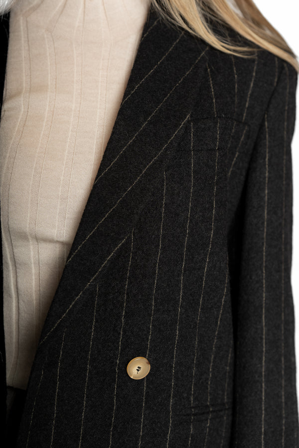 Elevate your everyday style with this timeless wool pinstripe blazer. Tailored in a relaxed, slightly oversized silhouette, it features structured shoulders, classic notched lapels, and a single-button closure for effortless sophistication. The subtle pinstripe pattern adds a refined touch, while rolled sleeves and a soft lining bring a modern, lived-in feel. Perfect for pairing with denim or trousers, this versatile piece transitions seamlessly from office to evening.
