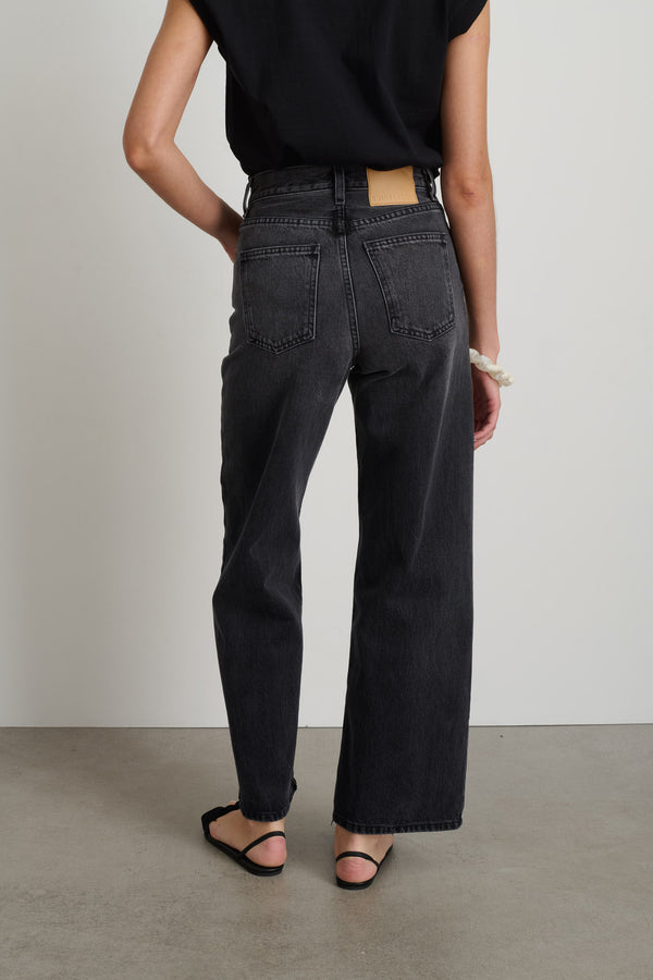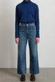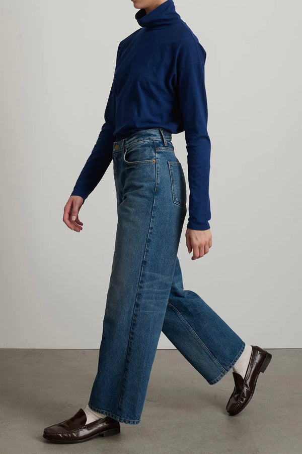 Jeans inspired by chance run-in's with longtime friend and collaborator Elissa Santisi and her timeless downtown ease. Cut from natural state un-dyed cotton denim, that is lifted to a nostalgic blue hue. Designed to sit at the natural waist and fall into a relaxed wide-leg silhouette.