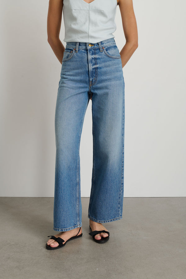 Cut from natural state un-dyed cotton denim, that is lifted to a nostalgic blue hue. Designed to sit at the natural waist and fall into a relaxed wide-leg silhouette.