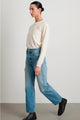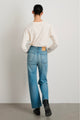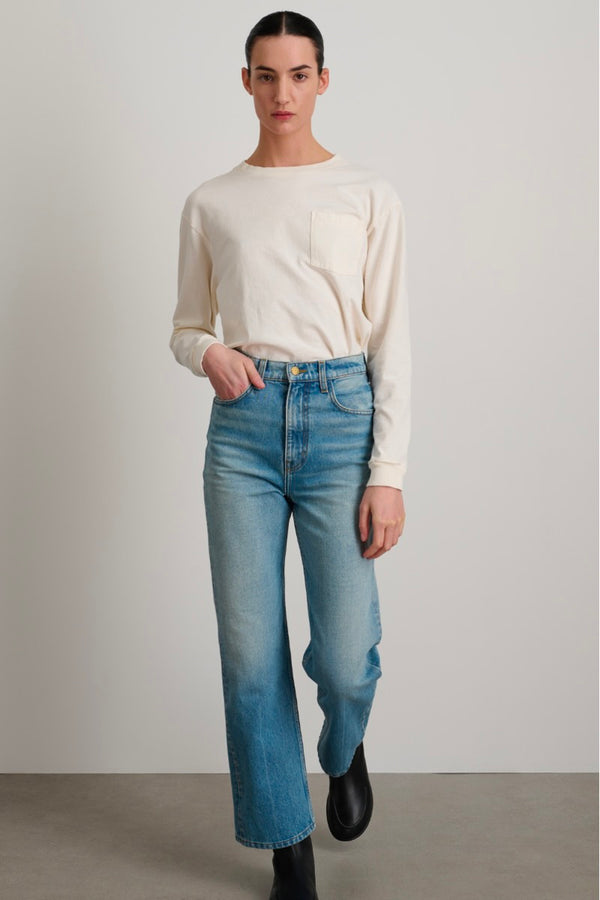 High rise fit sitting at the natural waist with a cropped inseam. Clean fit through the hip and thigh with a straight leg opening.