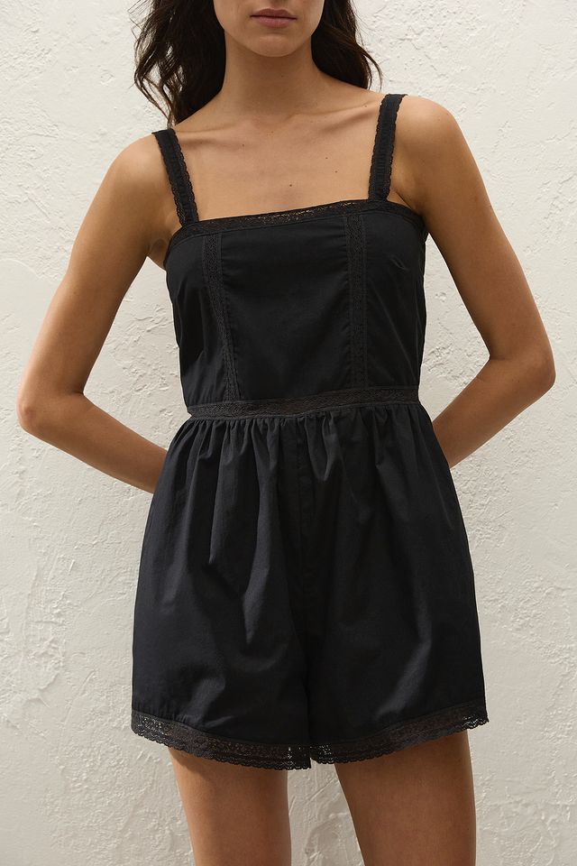 Chic and effortlessly feminine, this Faithfull the Brand black jumpsuit is crafted from lightweight cotton with delicate lace trim detailing at the hems. Designed with a softly structured bodice, adjustable shoulder straps, and a gently cinched waist, it offers an easy yet elevated silhouette—perfect for warm evenings, weekend getaways, or dressed up with heels for a night out.