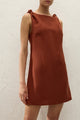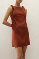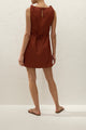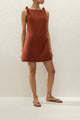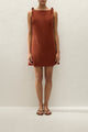 A vacation-inspired mini dress, designed from a signature 100% European Flax® linen in a warm terracotta. Sleeveless with a boat-style neckline and knot details at either shoulder, it cinches in at the waist with custom back waist ties before flaring into a soft A-line skirt. With effortless, summer appeal in mind, style with a simple sandal for lunch by the seaside.