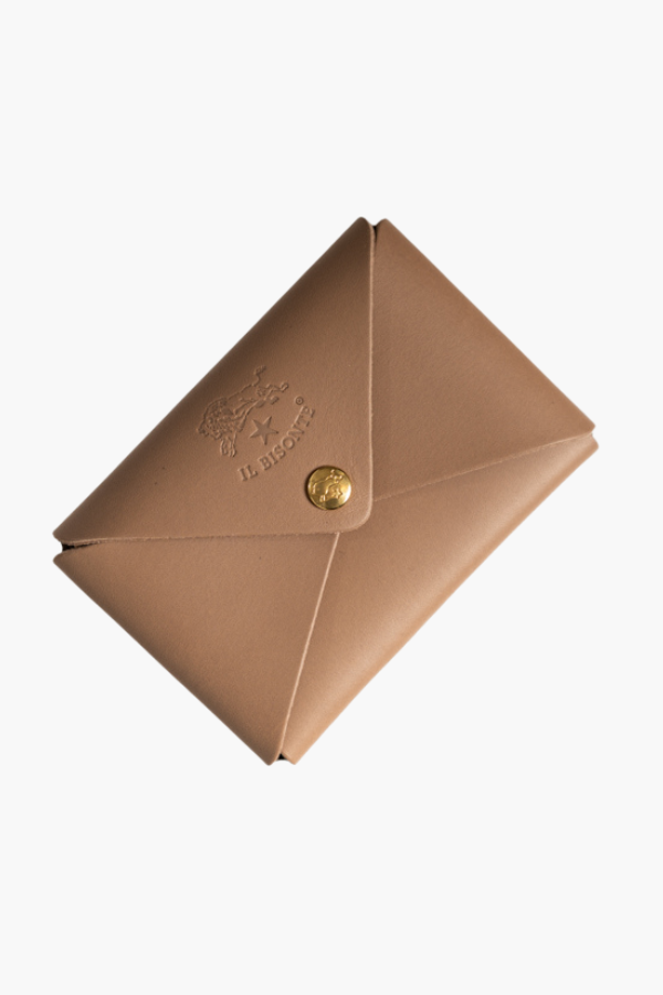 Unisex business card holder in vegetable-tanned cowhide. Made in Italy. Envelope closure with brass snap. Unlined interior.