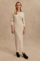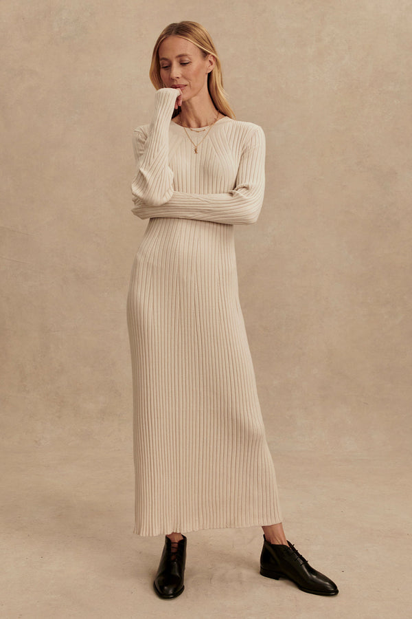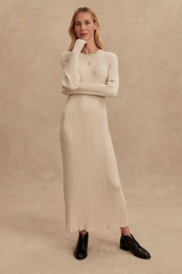 This long sleeve dress is cut to a relaxed fit, with a classic crew neckline and fashioning details throughout the body. Perfect for day to night styling.