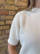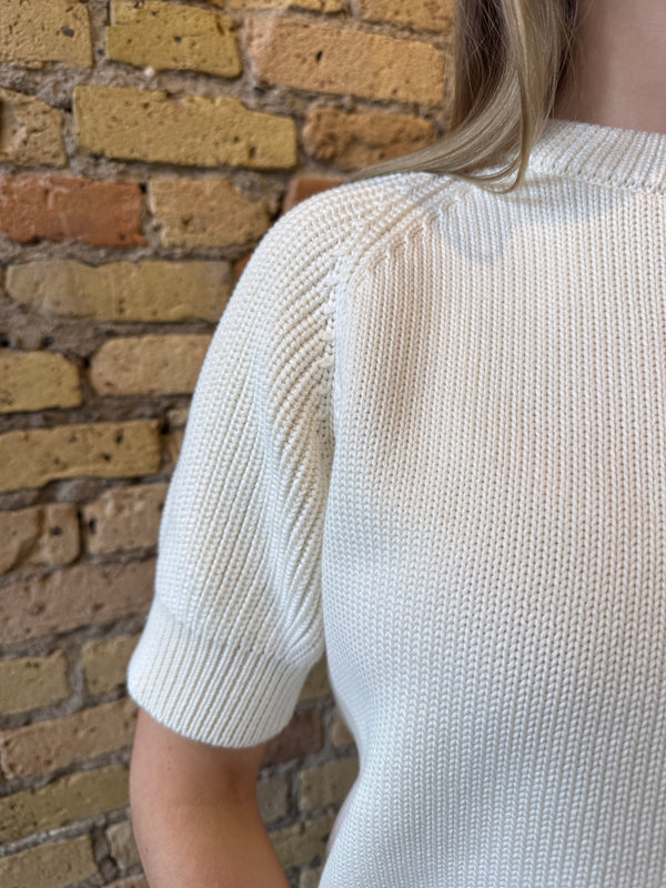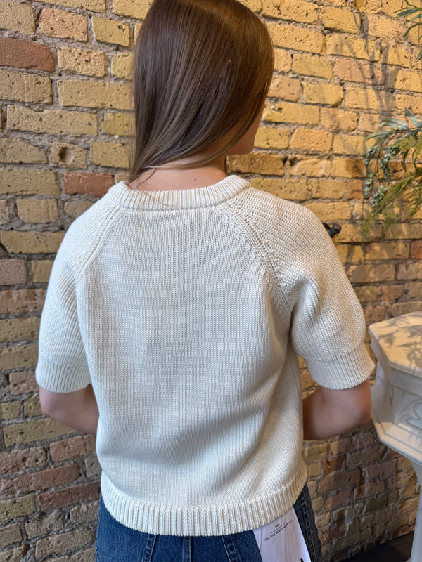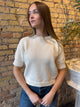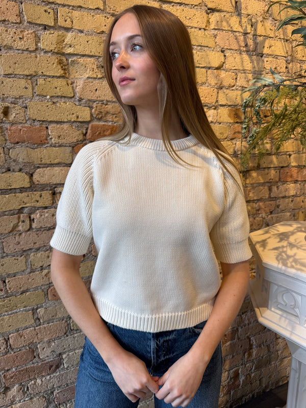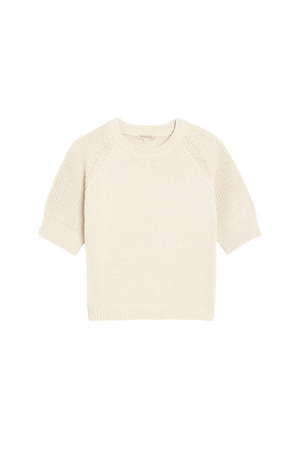 Crewneck sweater with half-length raglan sleeves in contrasting cardigan stitching.