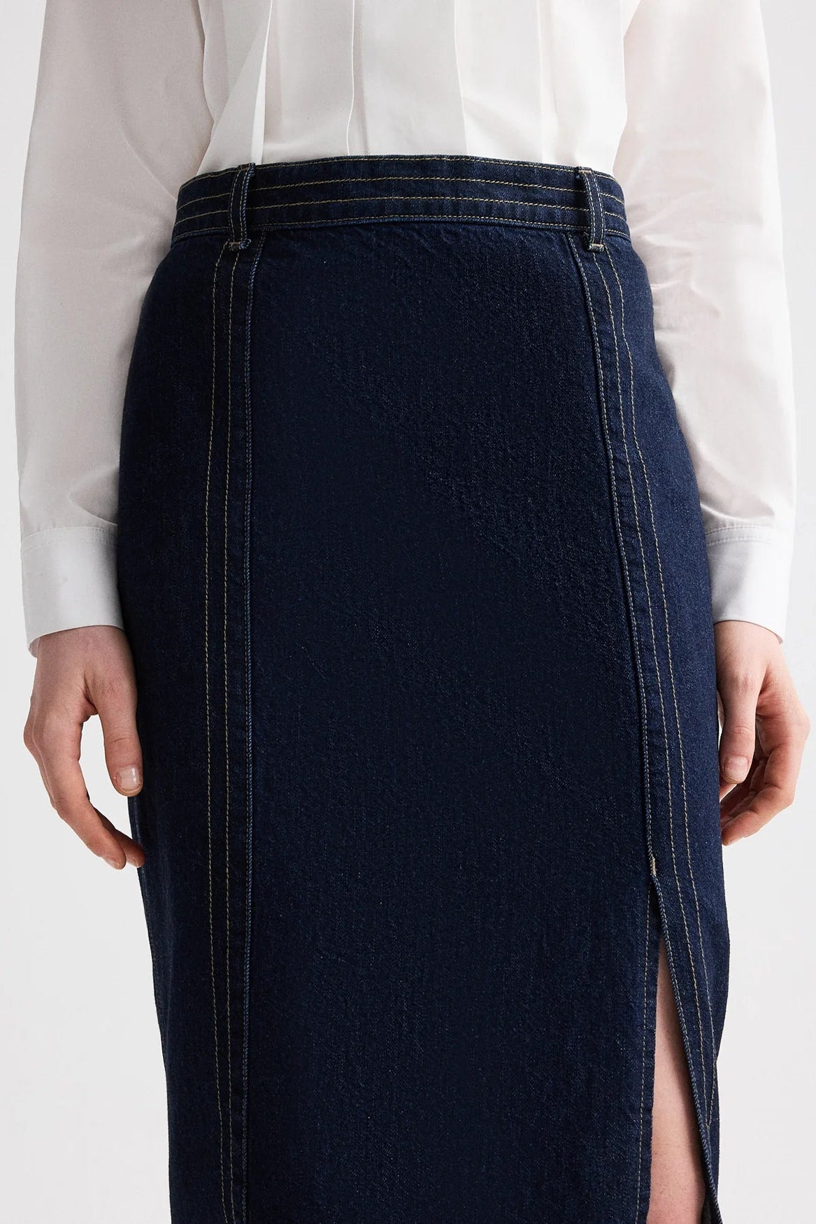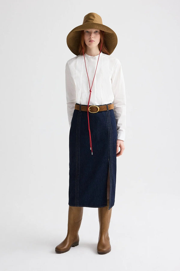 Midi skirt in heavy denim. Denim Skirt with Seams has a straight, elongated silhouette and a vertical front seam that adds definition. Finished with a high-rise waist, center back slit, and clean hems.