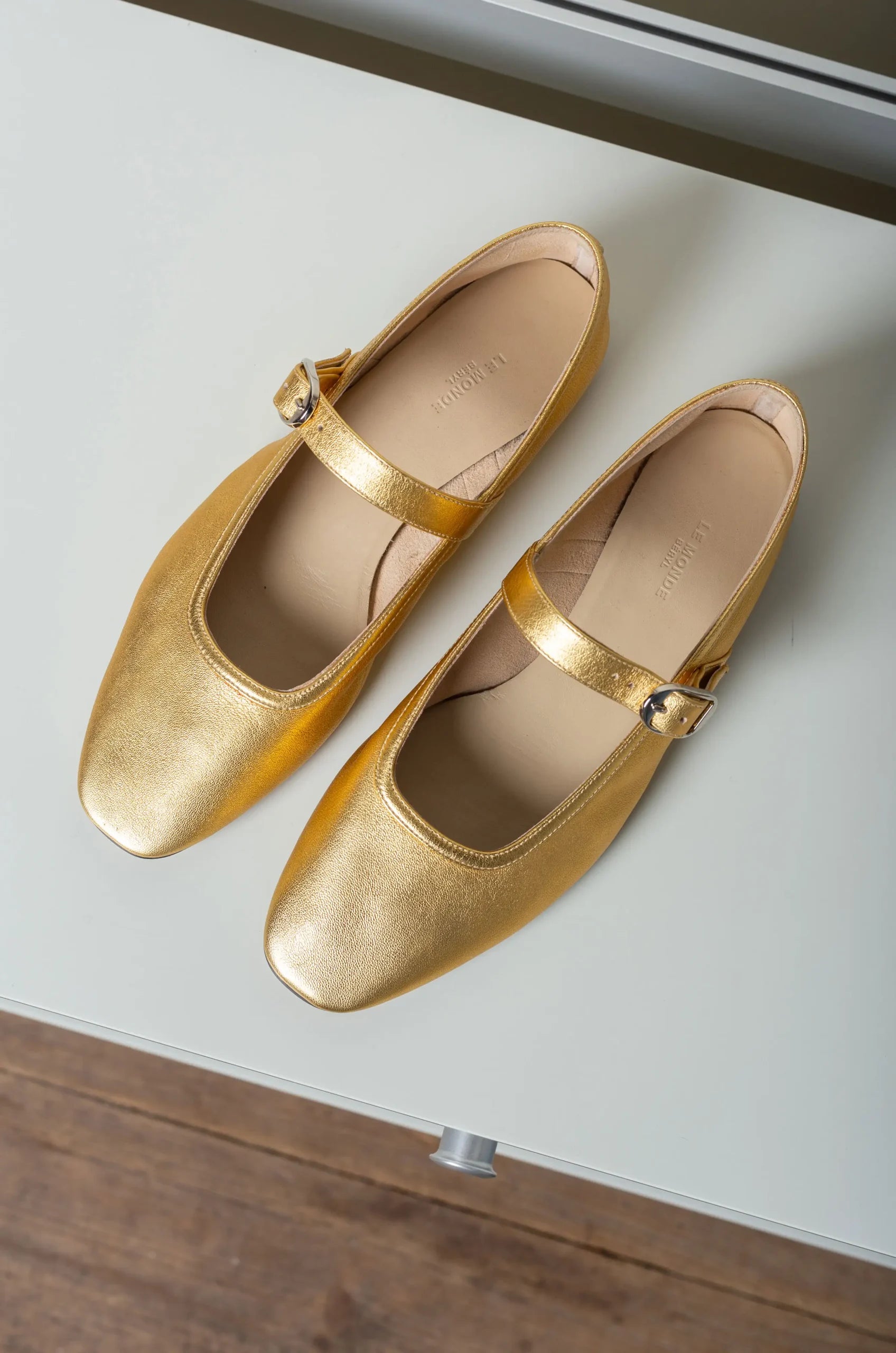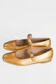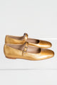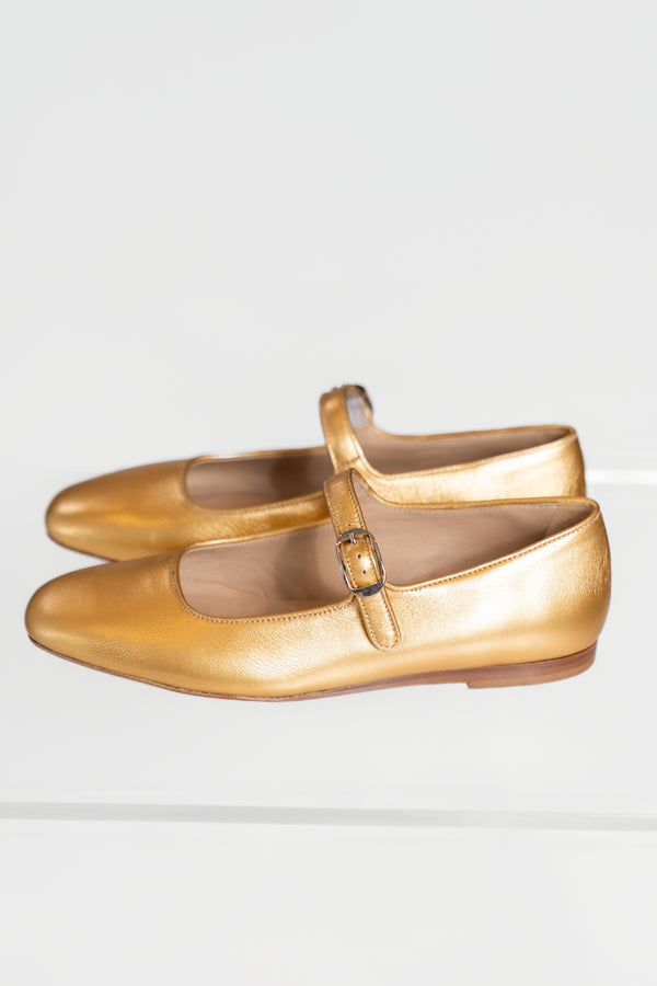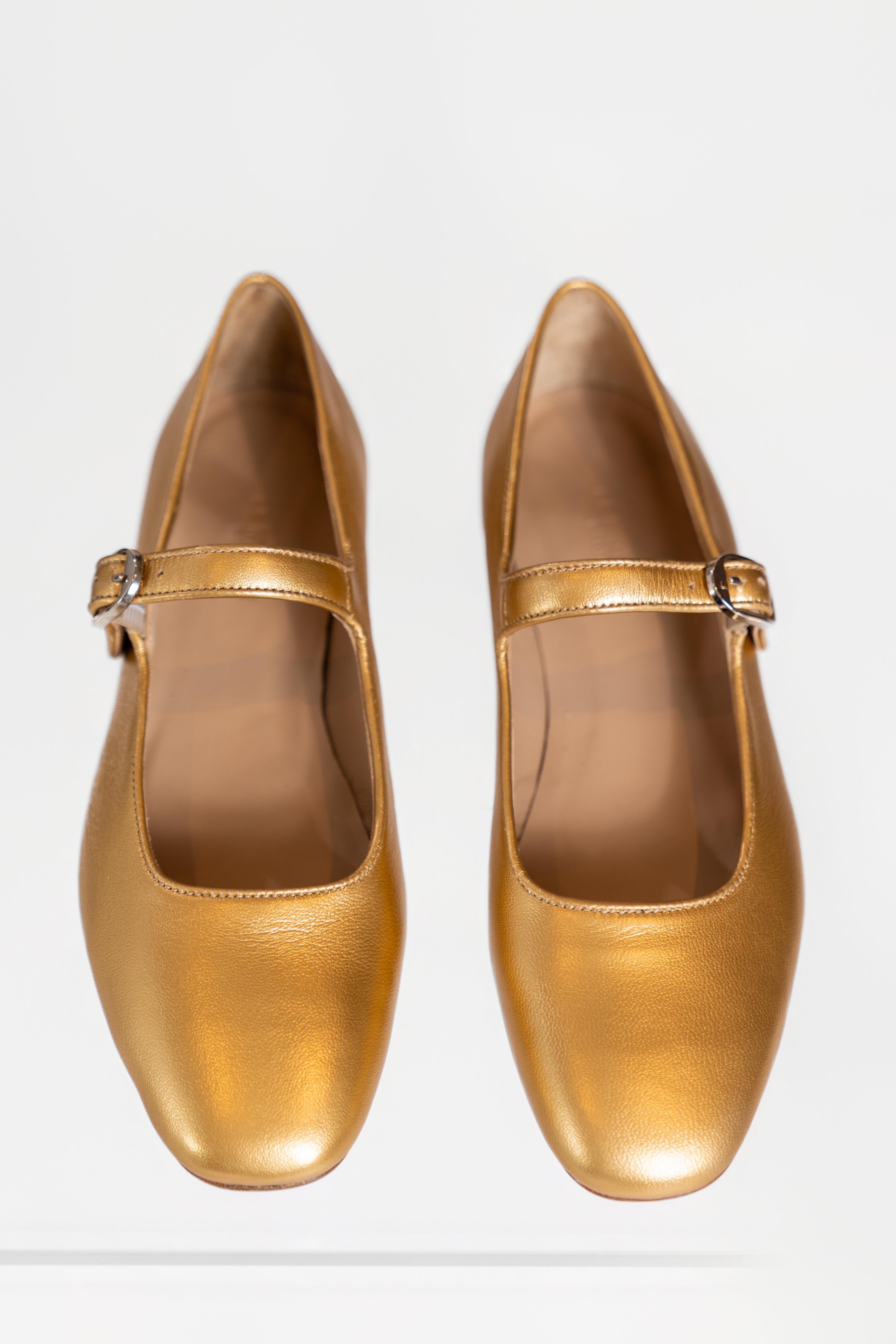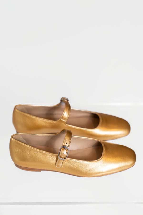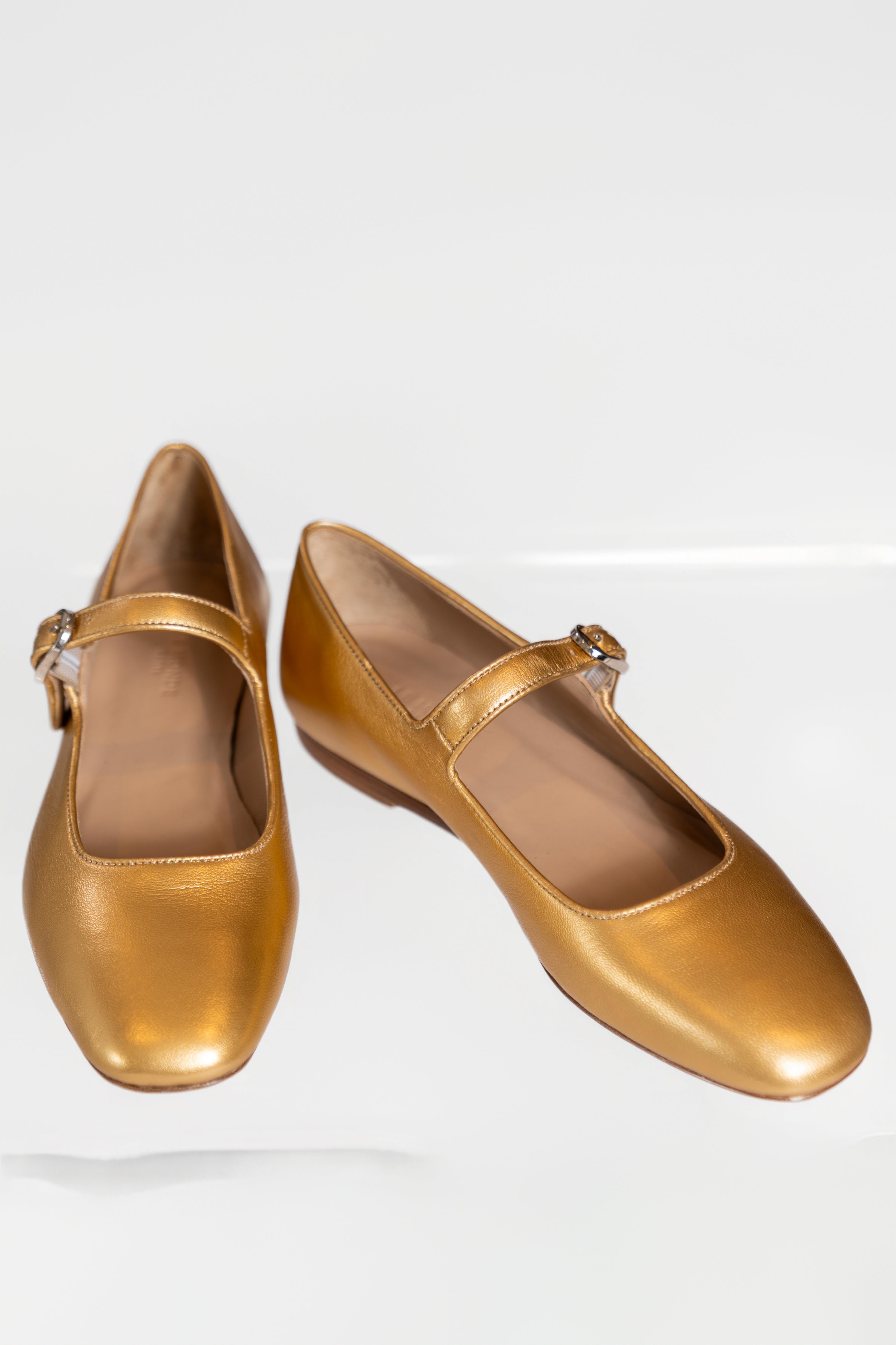 Mary Jane, handcrafted in Antique Gold leather with buckle-fastening, in a new sacchetto construction, with a soft cushioned calf leather insole and leather piping. 10mm heel. Made in Italy.