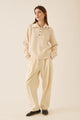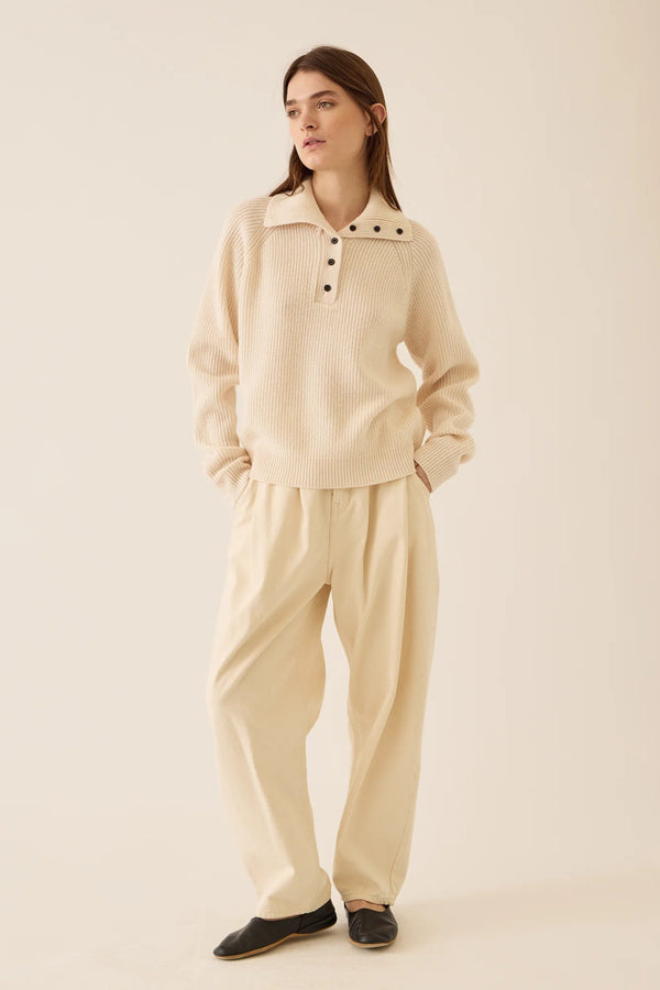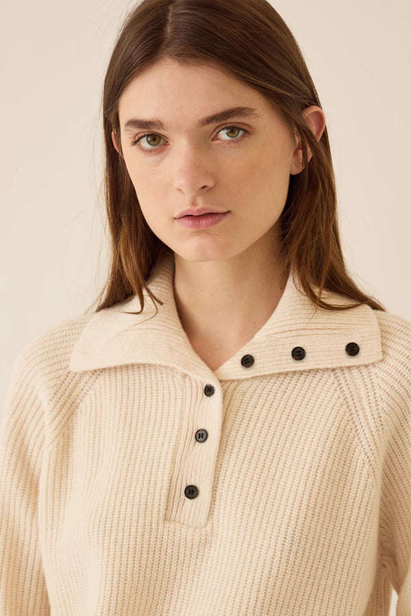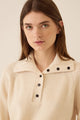 Long-sleeve sweater with wide ribbed collars. Collar has decorative non-functional buttons.