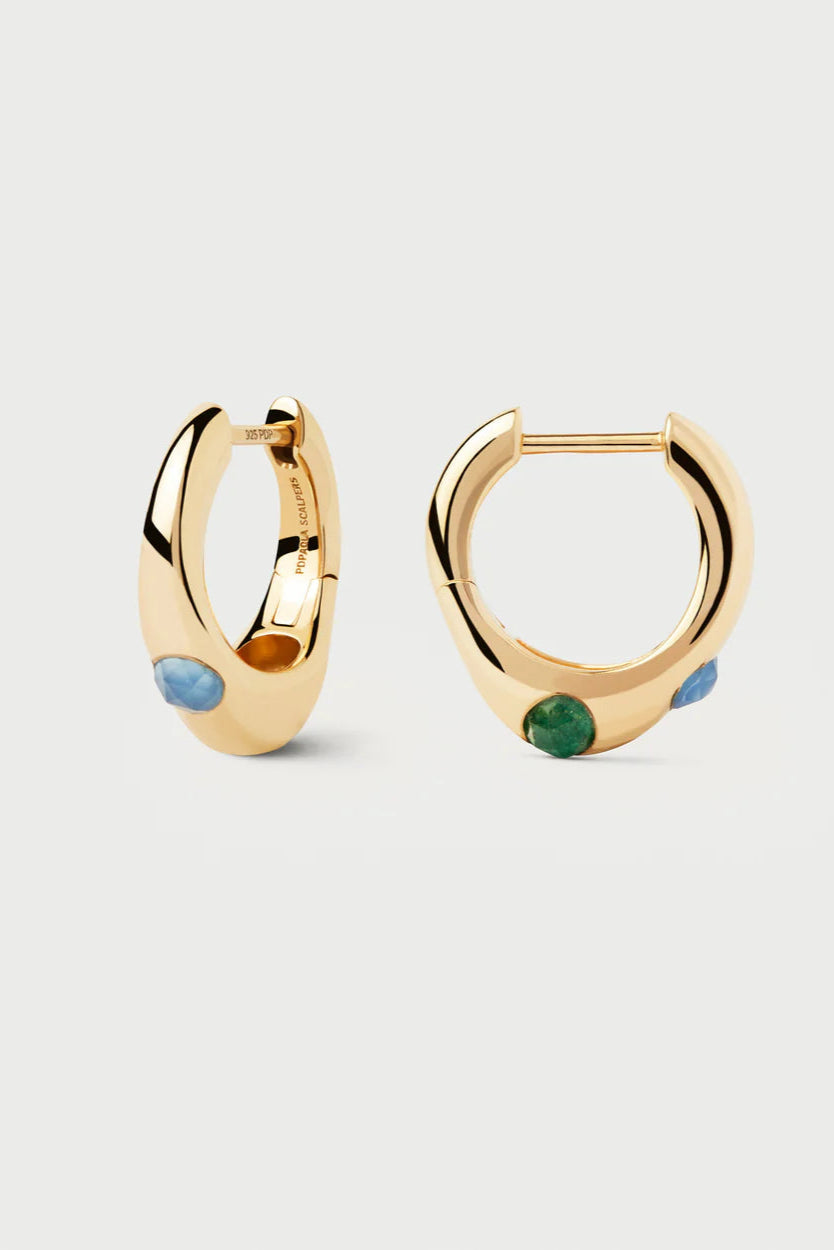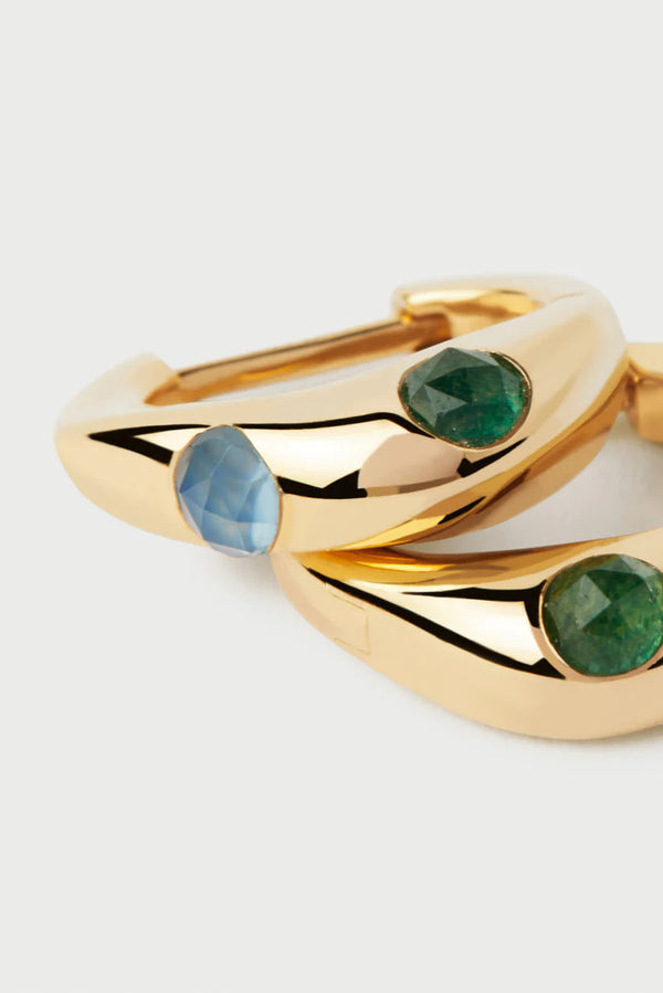 Gold-plated organic shape huggies embellished with green aventurine and chalcedony