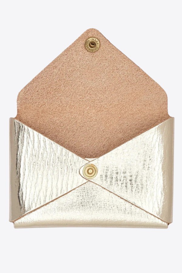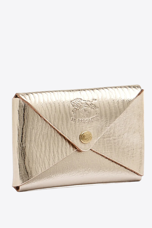 Unisex business card holder in vegetable-tanned cowhide. Made in Italy. Envelope closure with brass snap. Unlined interior.