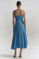 The Harlow Dress is crafted from linen stretch poplin with a structured yet breathable feel and soft drape in an ocean-blue hue. This midi silhouette features a square neckline, adjustable straps, and a smocked back panel, while seaming through the bodice enhances the shape and is finished with an asymmetric hemline..