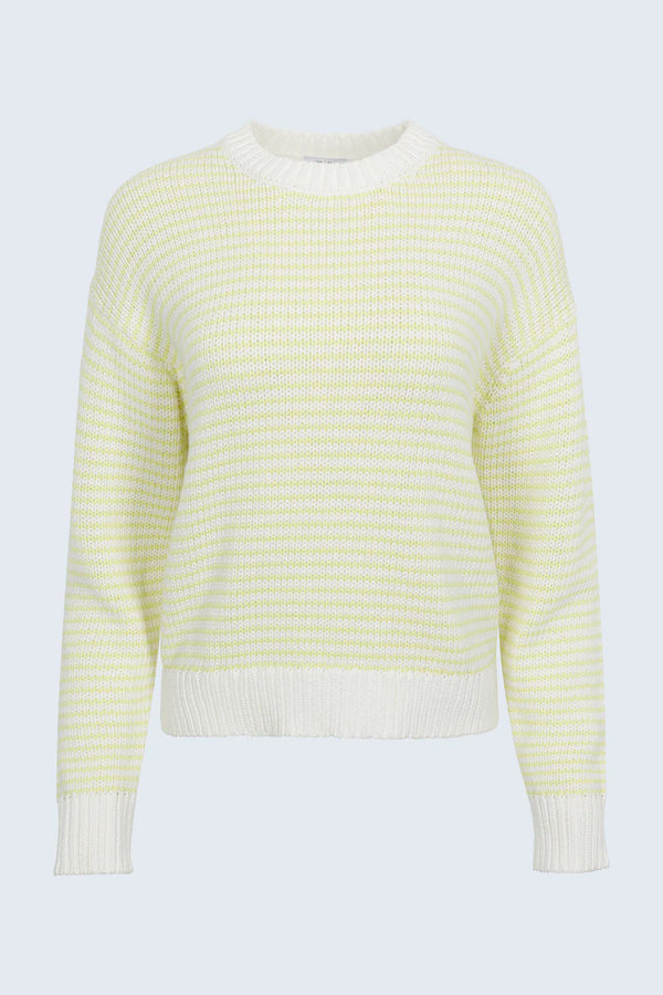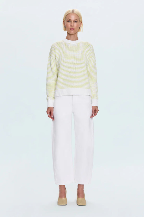 A classic made modern, Aura features a crew neckline and relaxed fit that drapes effortlessly over denim, trousers, or skirts. Knit from 100% cotton, it’s soft yet structured—easy to layer, easy to love. Finished with ribbed details for a touch of texture. Limeade, a refreshing pastel green, adds a playful hit of color that brightens the season.