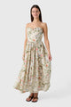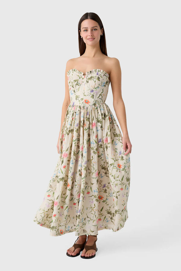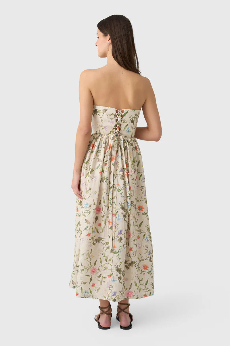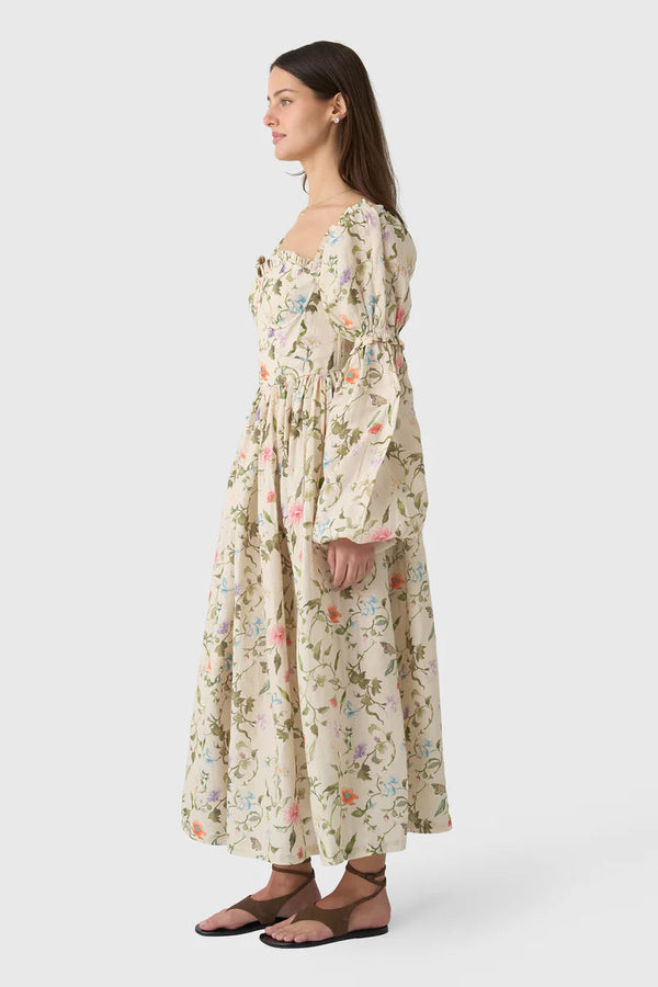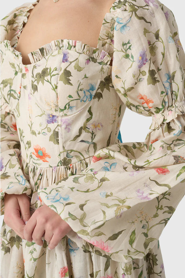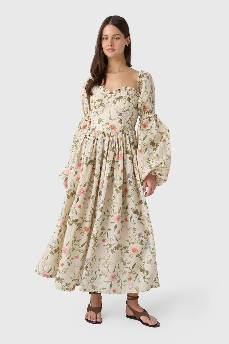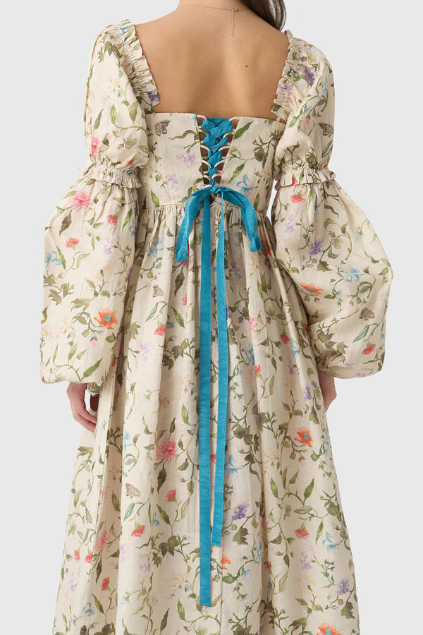 This exquisite vintage-inspired dress is crafted from luxurious linen with a charming floral print and features a structured bodice with a lace-up corset back that flows into a beautifully gathered skirt. Dramatic puff sleeves offer a touch of romantic flair and can be removed for a versatile, sleeveless silhouette that is perfect for elegant garden soirées.