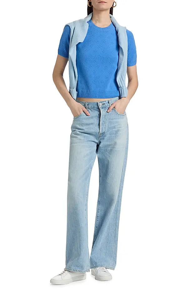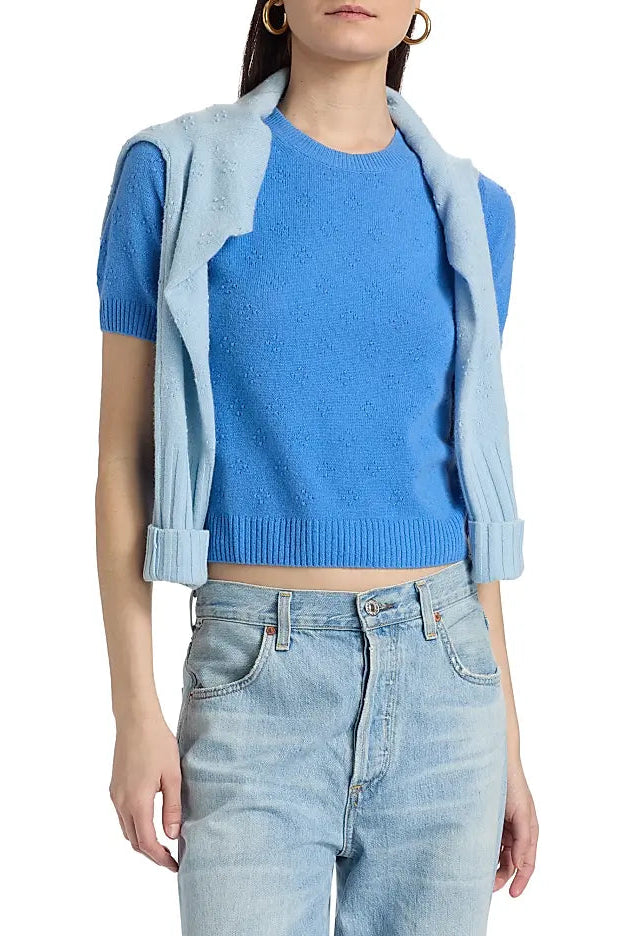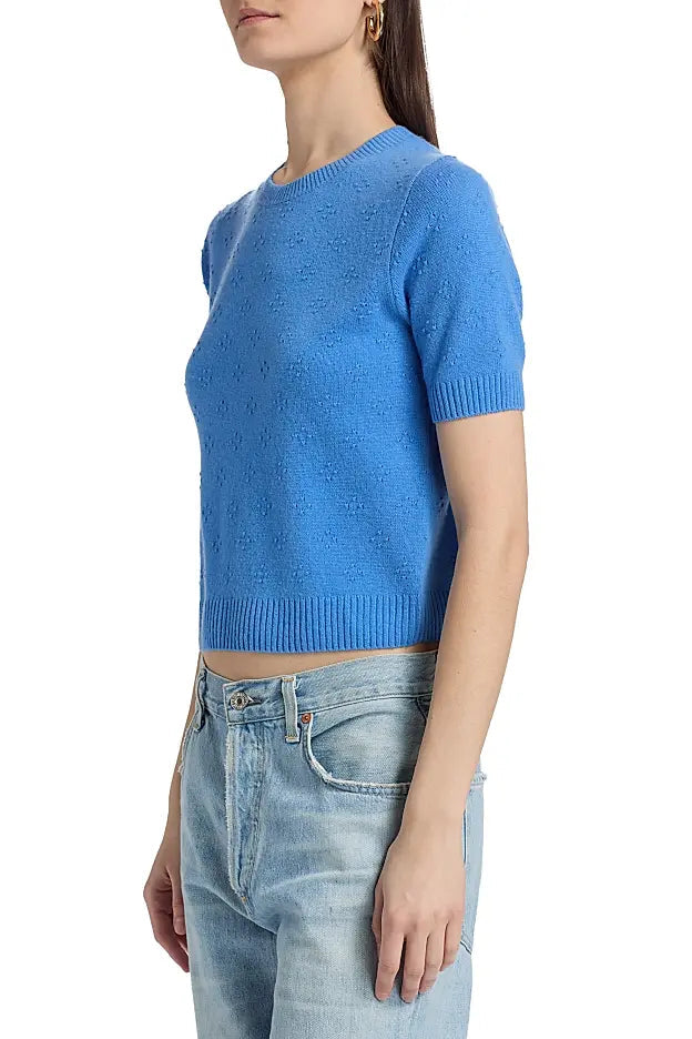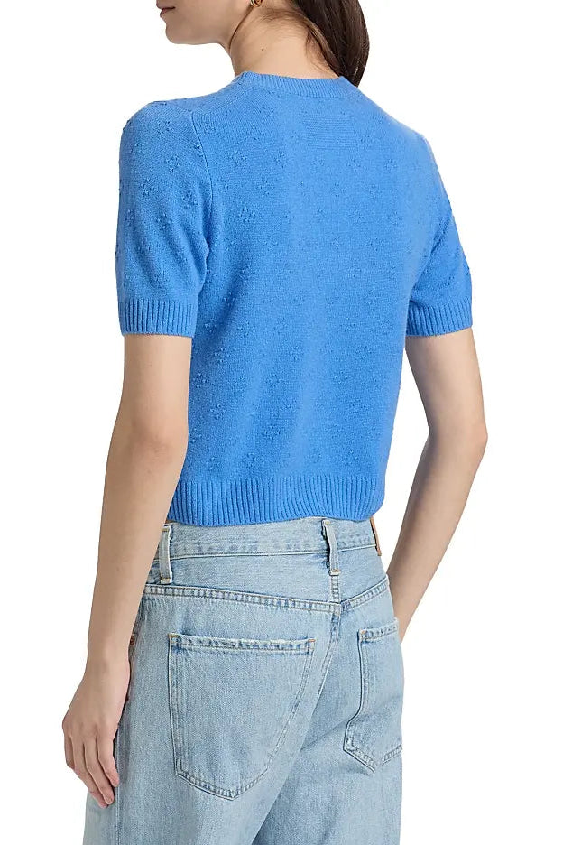 The Compass Sweater Tee is a women’s light-weight cashmere short-sleeve sweater made from 100% cashmere with a textured popcorn stitch. Featuring a crew neck and ribbed trim, this versatile knit pairs effortlessly with denim or layers easily with other sweaters and cardigans.