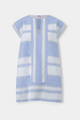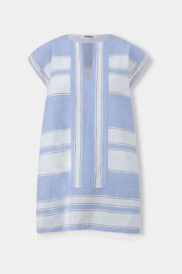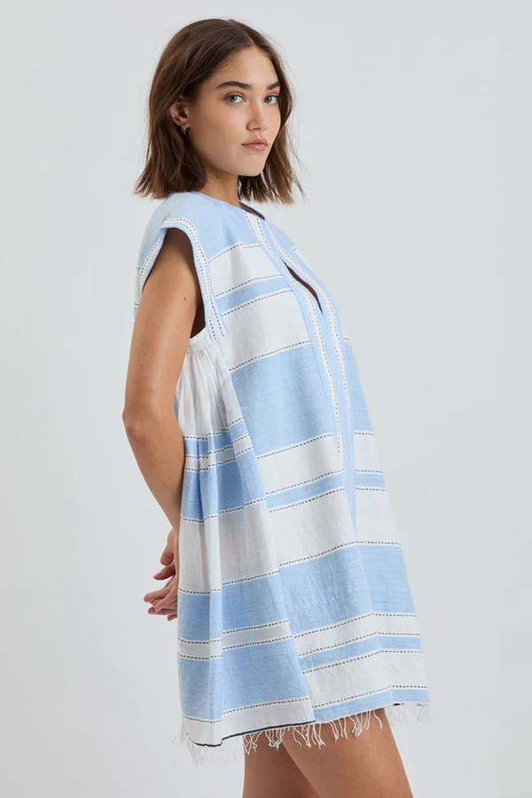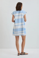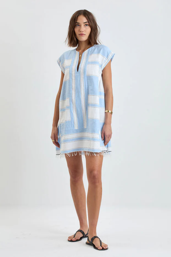 This short dress features a slit-neckline, short sleeves to create a flowy A-Line silhouette. This versatile cover-up dress is adorned with decorative tibeb weaving details and ruching at the side panels to add volume.