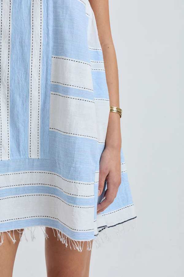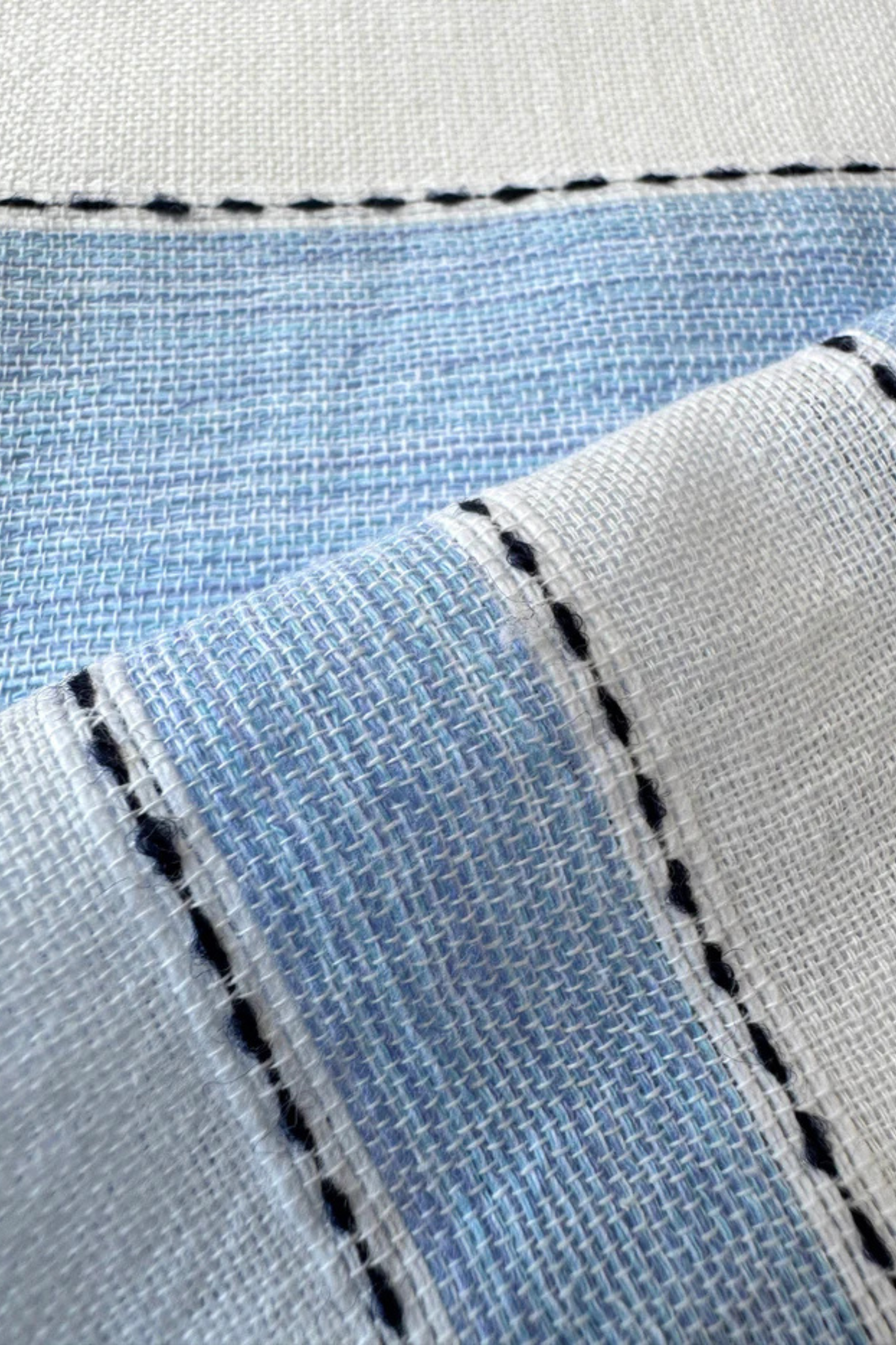 The Debre Sky Collection features bold, crisp white stripes on a sky-blue background, accented with black stitch detailing. Inspired by African textiles, the engineered stripes create the look of appliqué while being seamlessly woven into a single, sophisticated design.