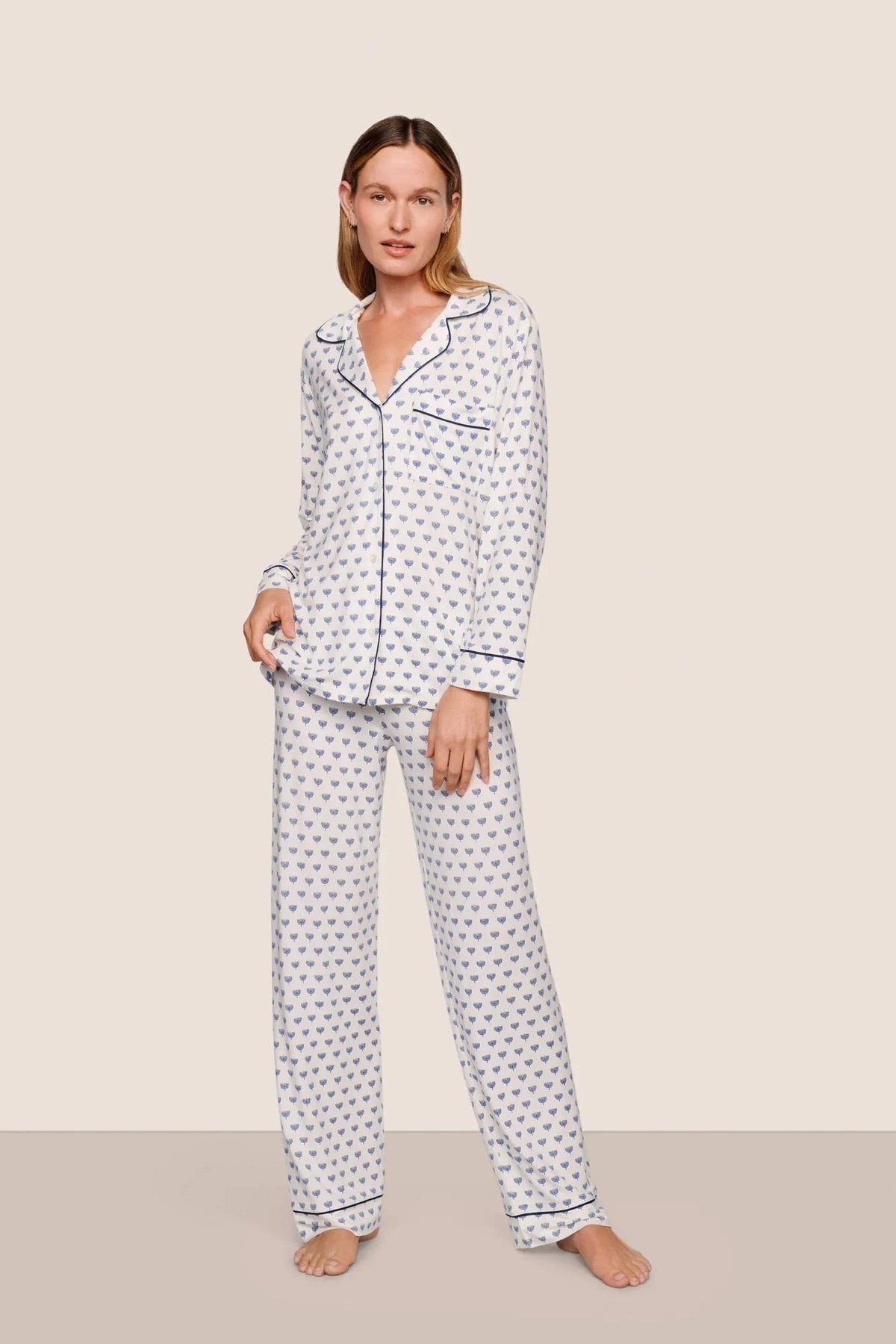 The PJ that started it all. Made from TENCEL™ Modal fibers and a touch of elastane, this buttery soft fabric is verified by OEKO-TEX® Standard 100, meaning it’s dyed with safe and non-toxic dyes. This relaxed long sleeve set features contrast piping, a button-front top with a notch collar and functional pocket, and a low-rise straight leg pant with a thin elastic waistband.
