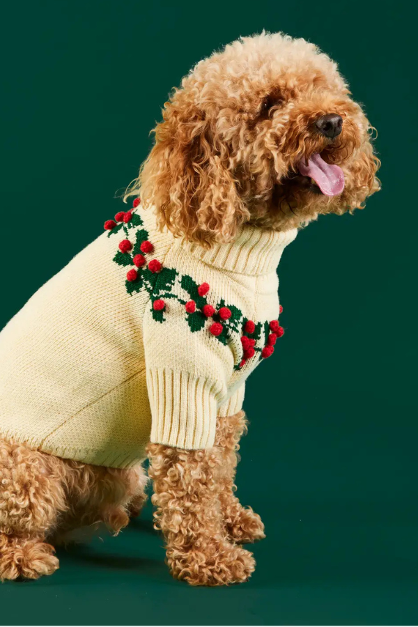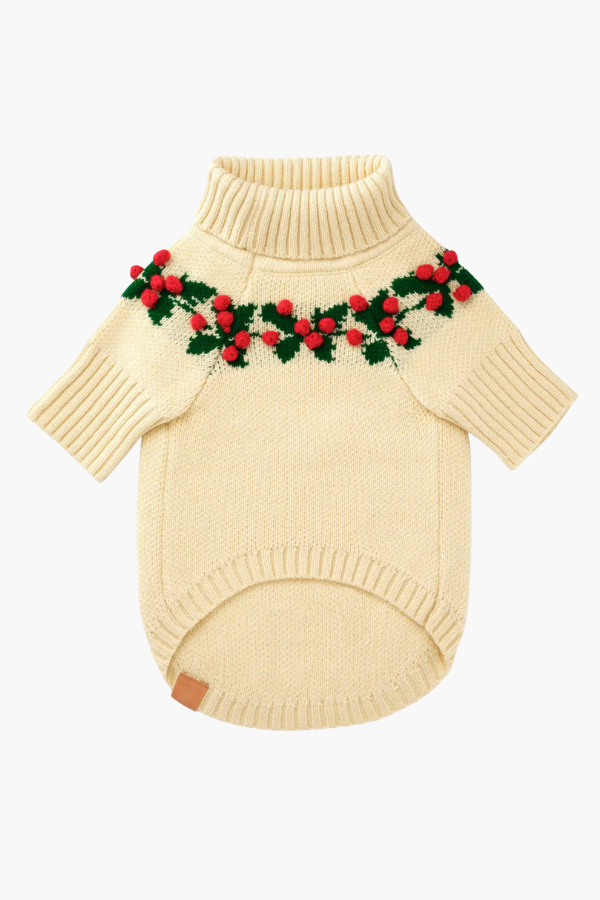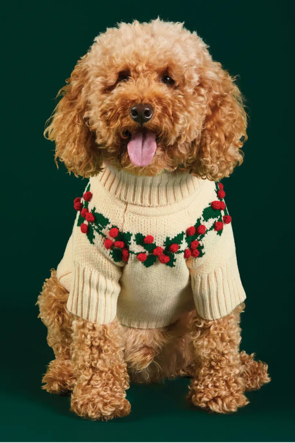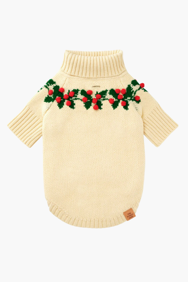 It's a holly jolly sweater for the most festive of pups! Accented with charming hand-sewn "berries", The Foggy Dog Holly Jolly sweater is a Christmas classic.
