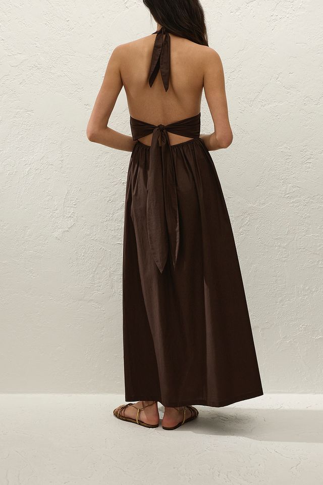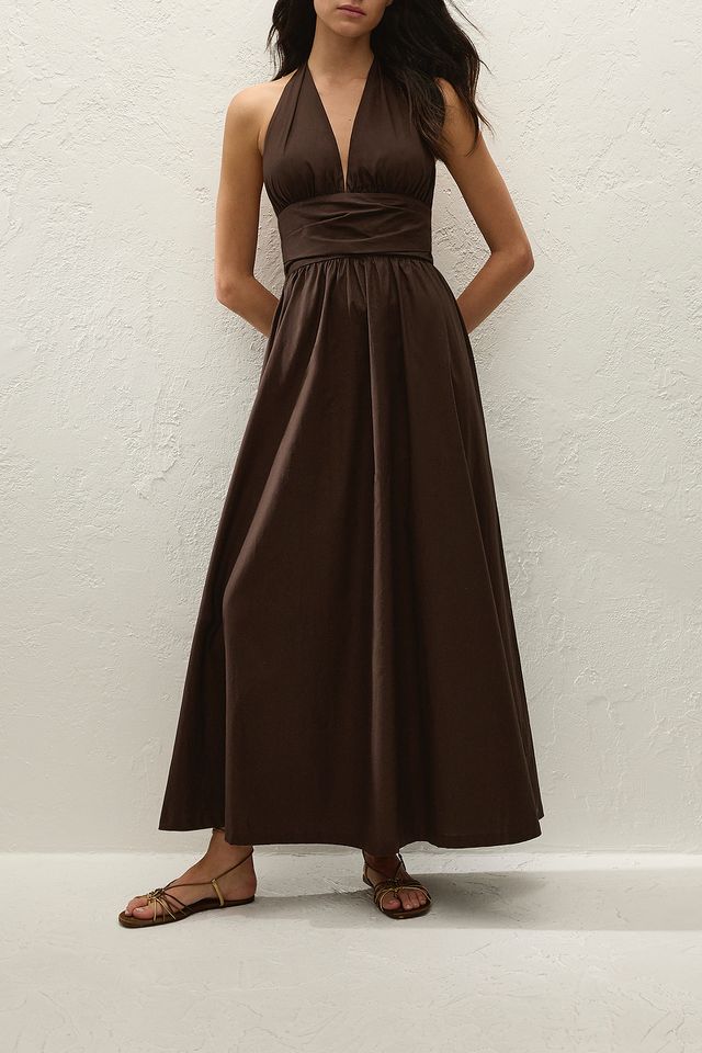 Effortlessly elegant, this Faithfull the Brand maxi dress is crafted from 100% breathable cotton in a rich Espresso hue. Featuring a flattering halter neckline, softly gathered waist, and flowing skirt, it’s the perfect blend of comfort and understated sophistication—ideal for warm days, vacations, or dressed-up evenings.
