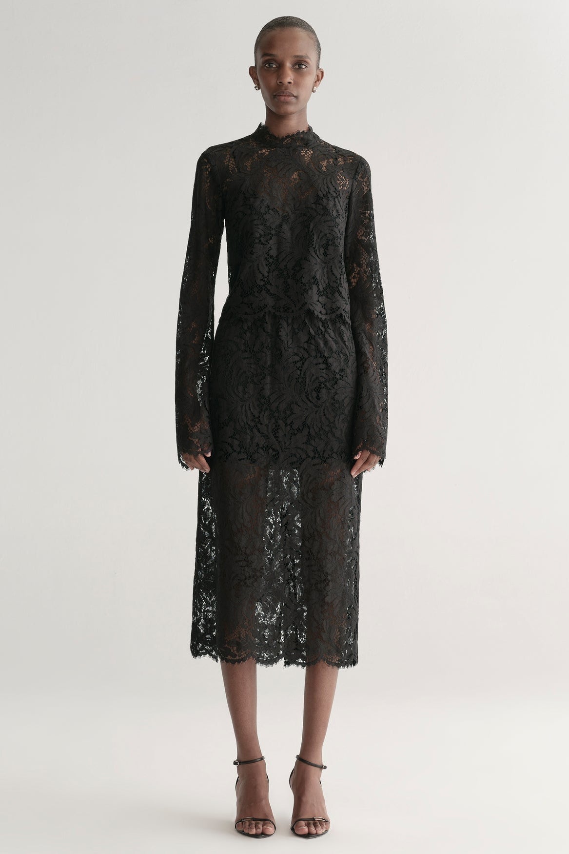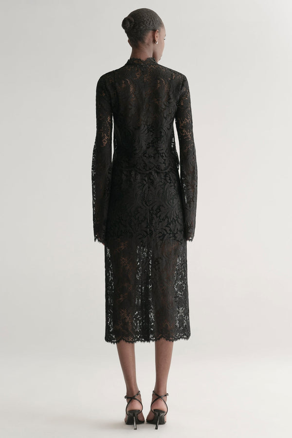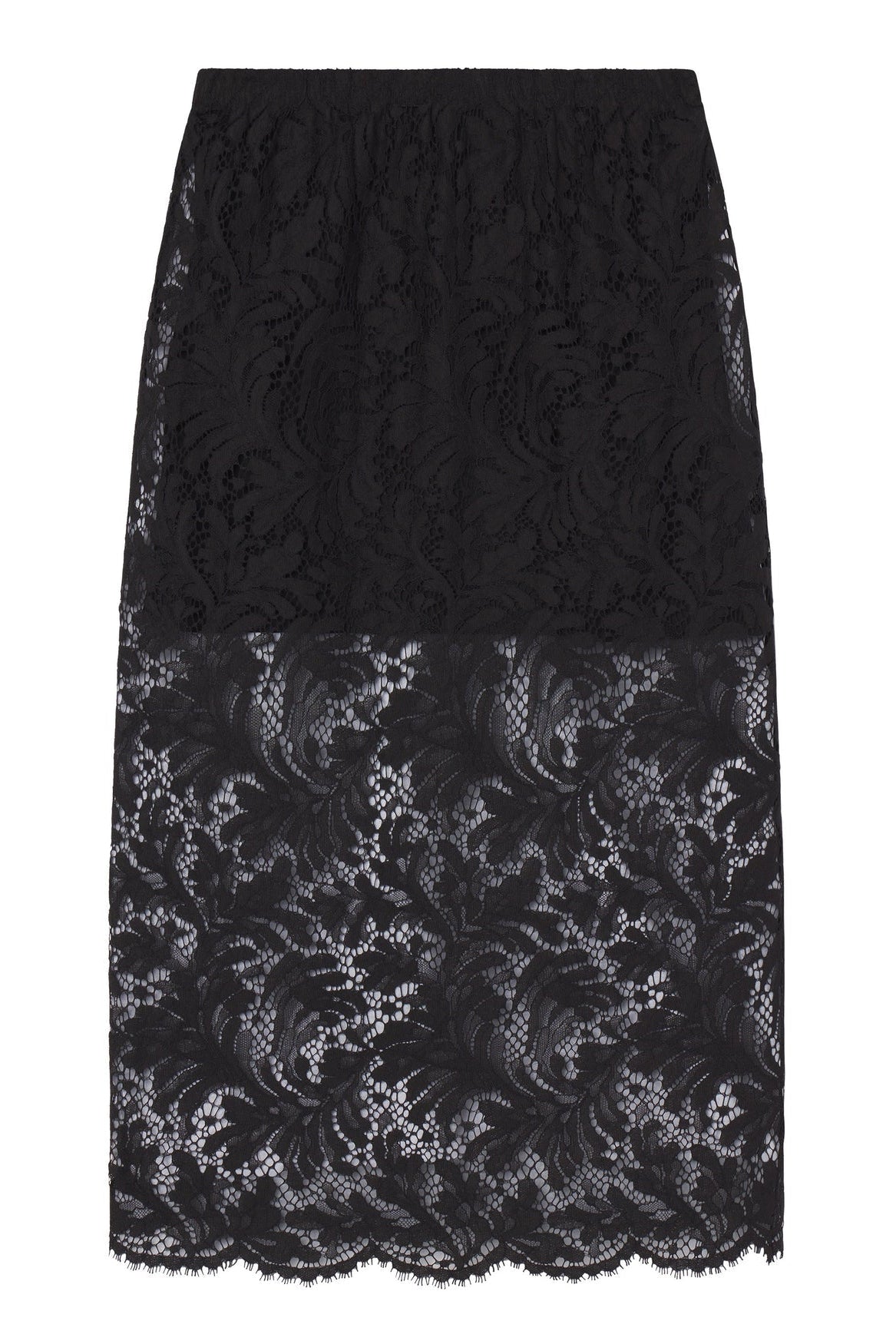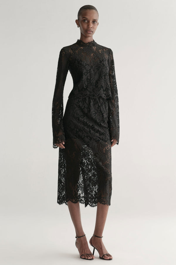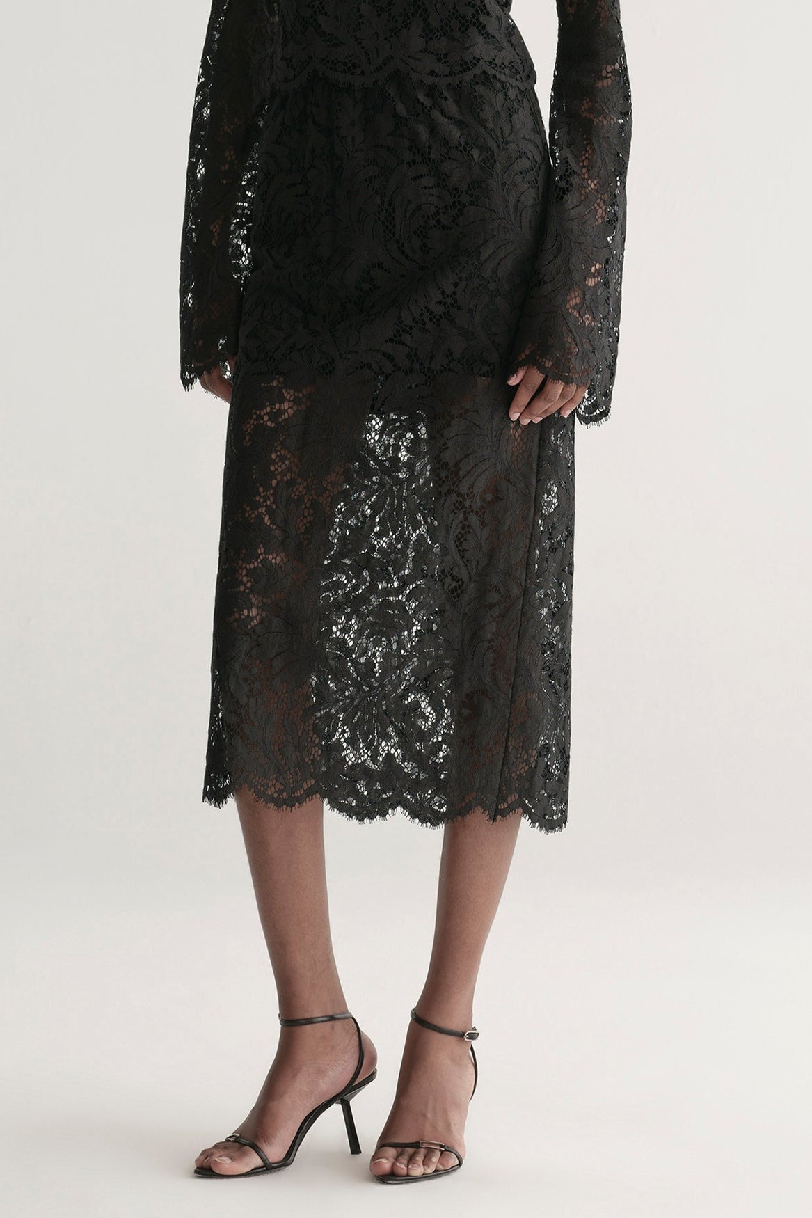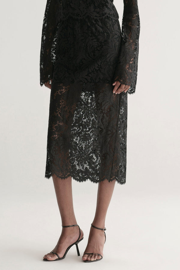 The Lydia Skirt is classic lace reinterpreted in a column silhouette. Cut from archival French lace with a botanical-inspired pattern, this midi-length sheath layers over a built-in mini slip for a streamlined, contemporary shape. Finished with scalloped edges, it's a polished yet romantic piece for holiday evenings, cocktails, or special occasions. Archival French lace with a botanical motif. Sheath silhouette layered over a built-in mini slip for coverage. Scalloped hem for refined detailing. Calf-length for a modern, elevated take on lace.