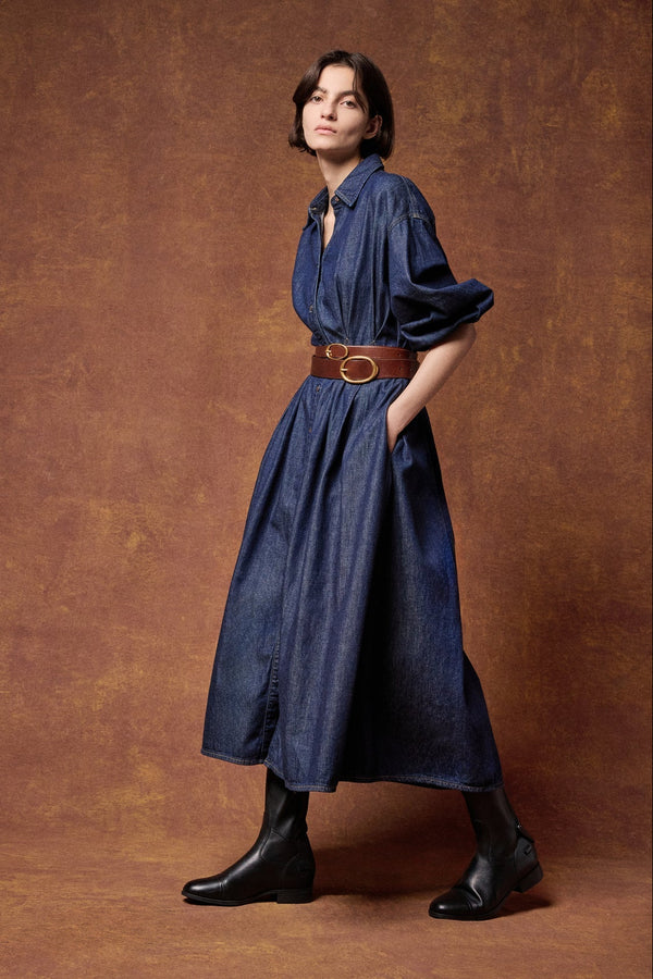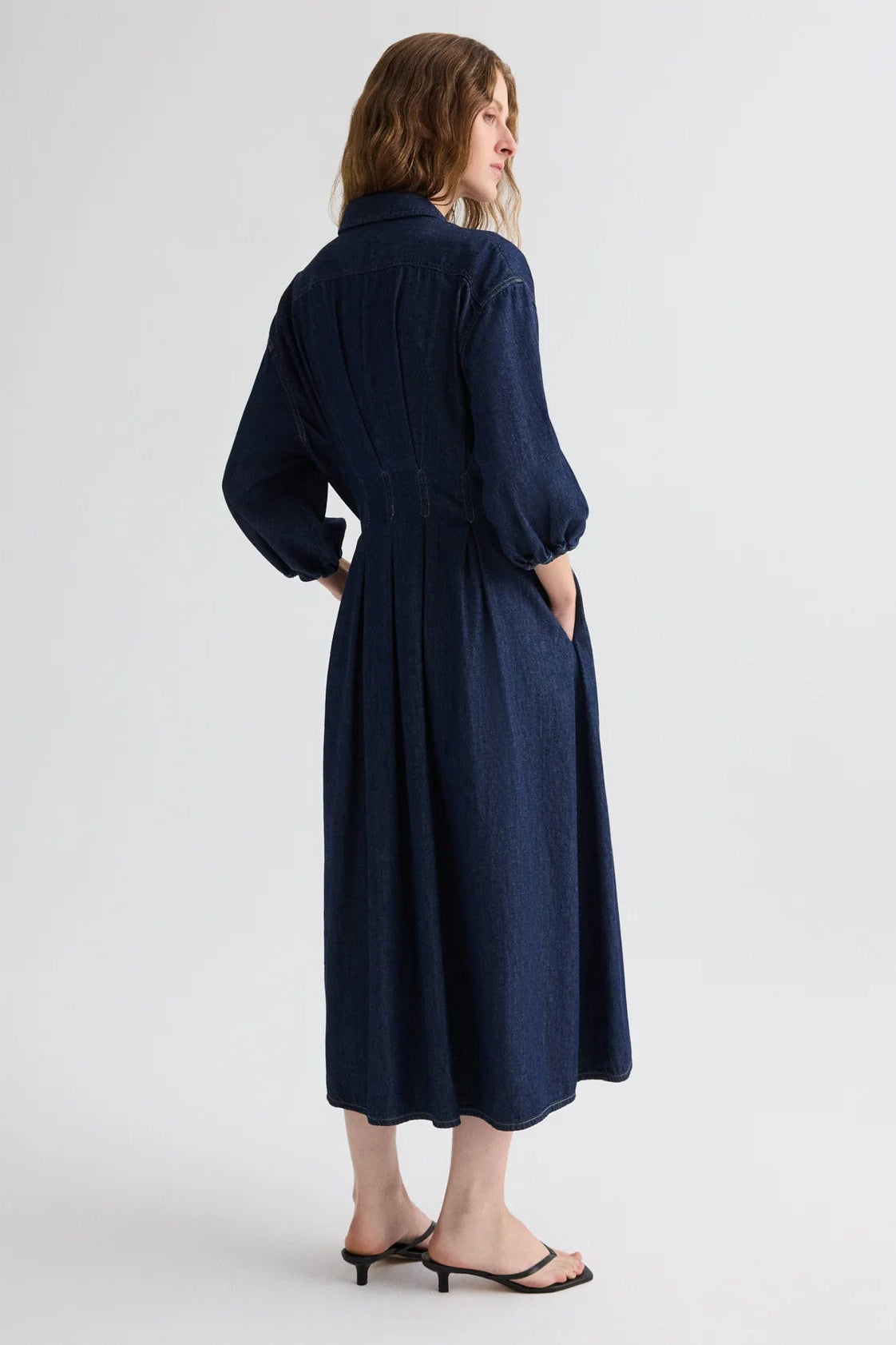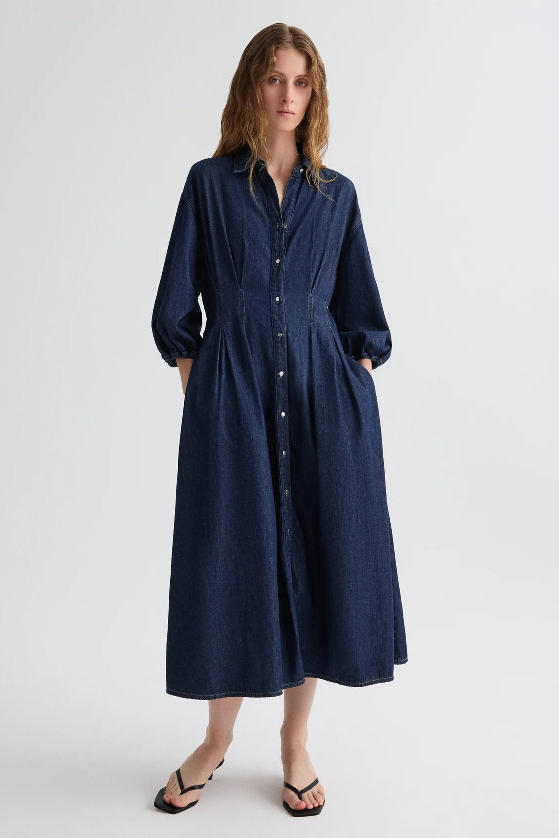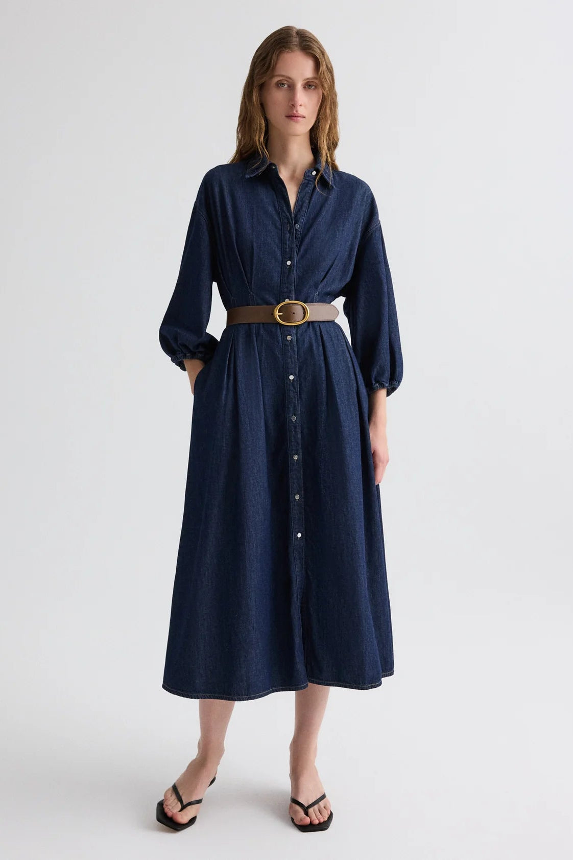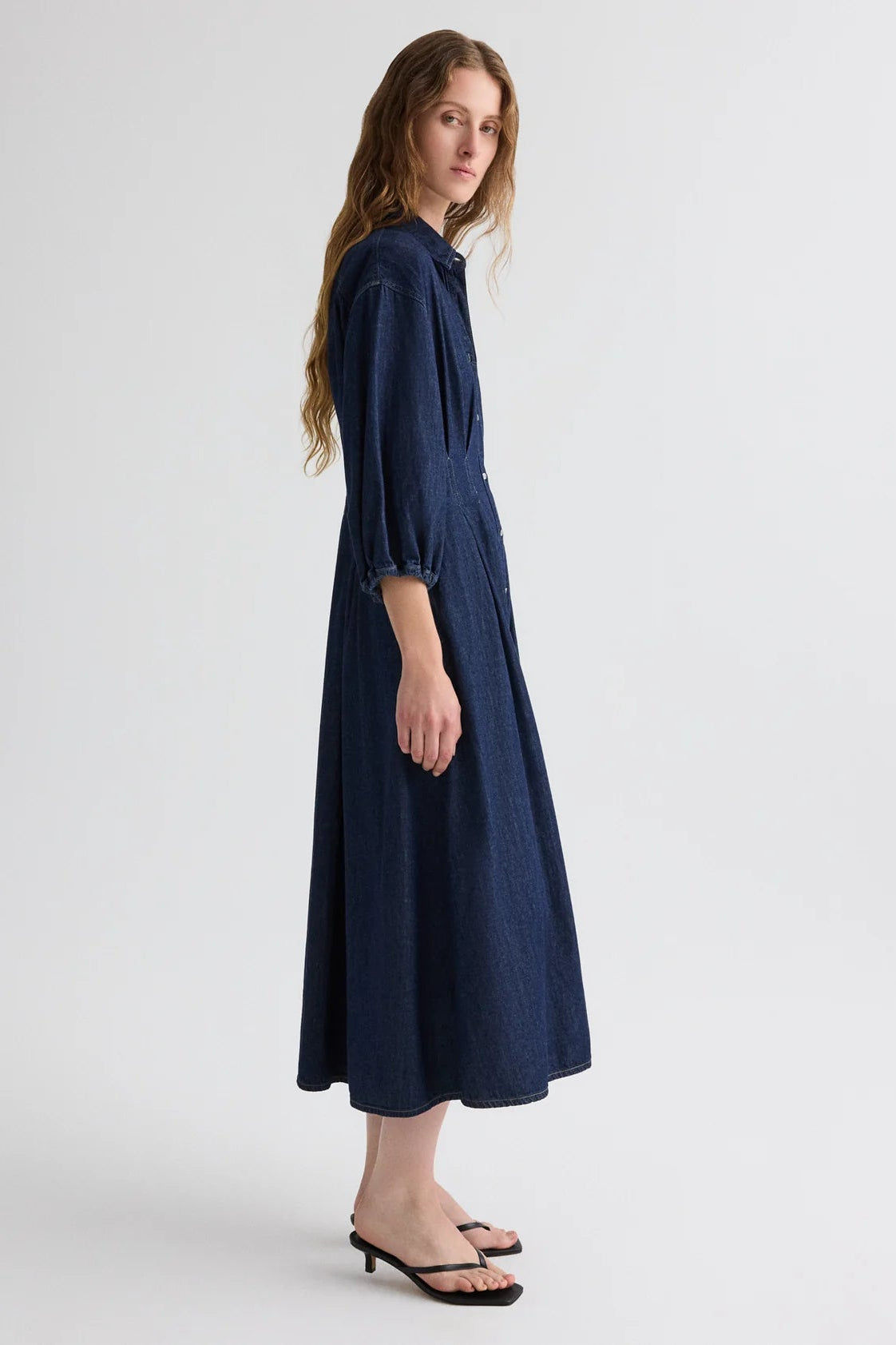 Long-sleeve shirtdress in denim shirting. The Mason Dress has a fitted bodice with contour seaming that releases into a full, midi-length skirt. Finished with a button-front placket, side seam pockets, and volume at the sleeves.