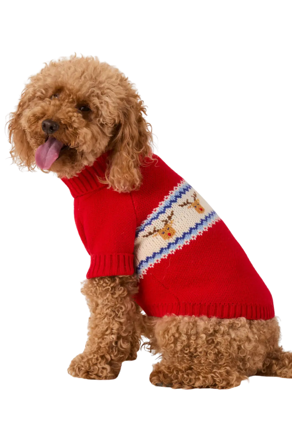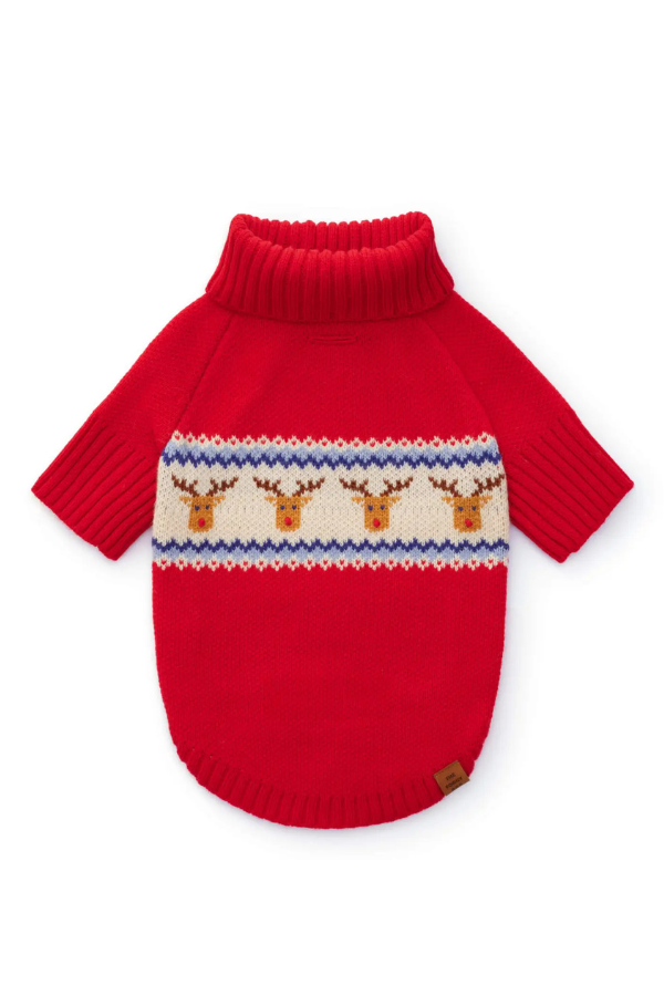 Featuring whimsical reindeer with bright red embroidered noses, this fair isle sweater is the definition of holiday cheer.