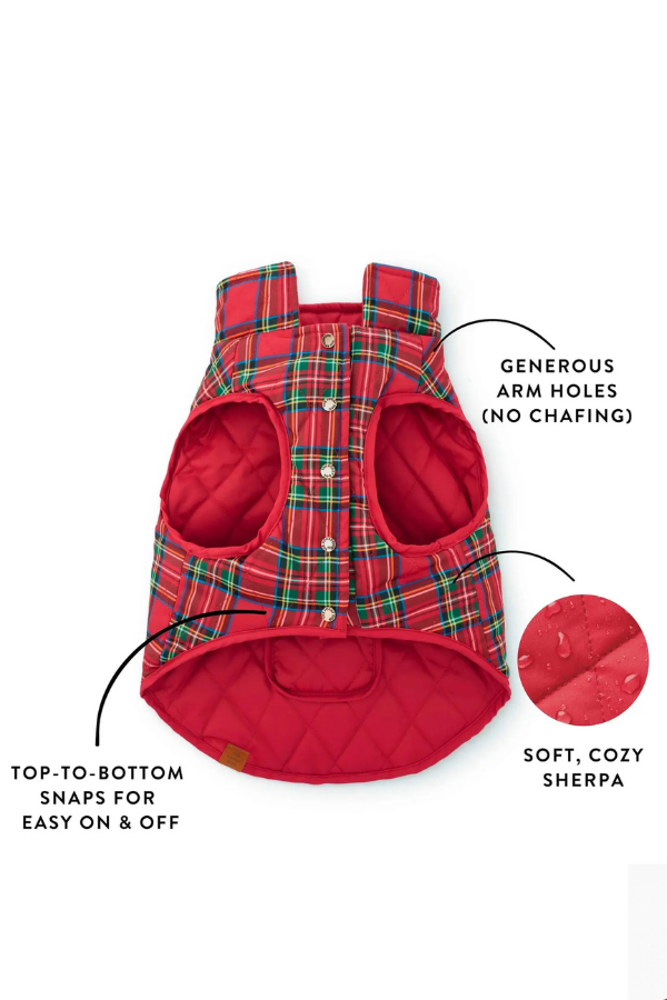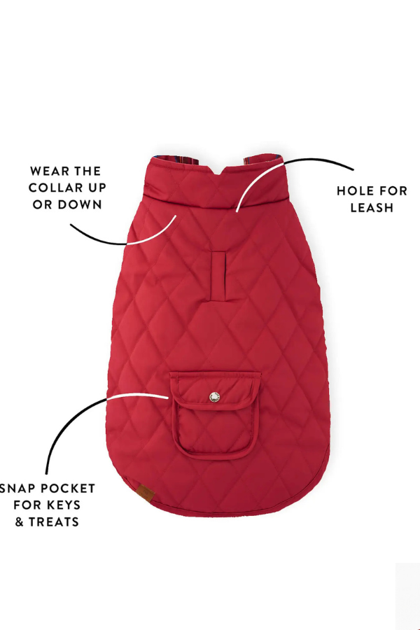 Keep your pup warm and dry this winter with our fully reversible and water-resistant quilted jacket. Featuring a leash hole, pocket, and snaps for easy on and off.