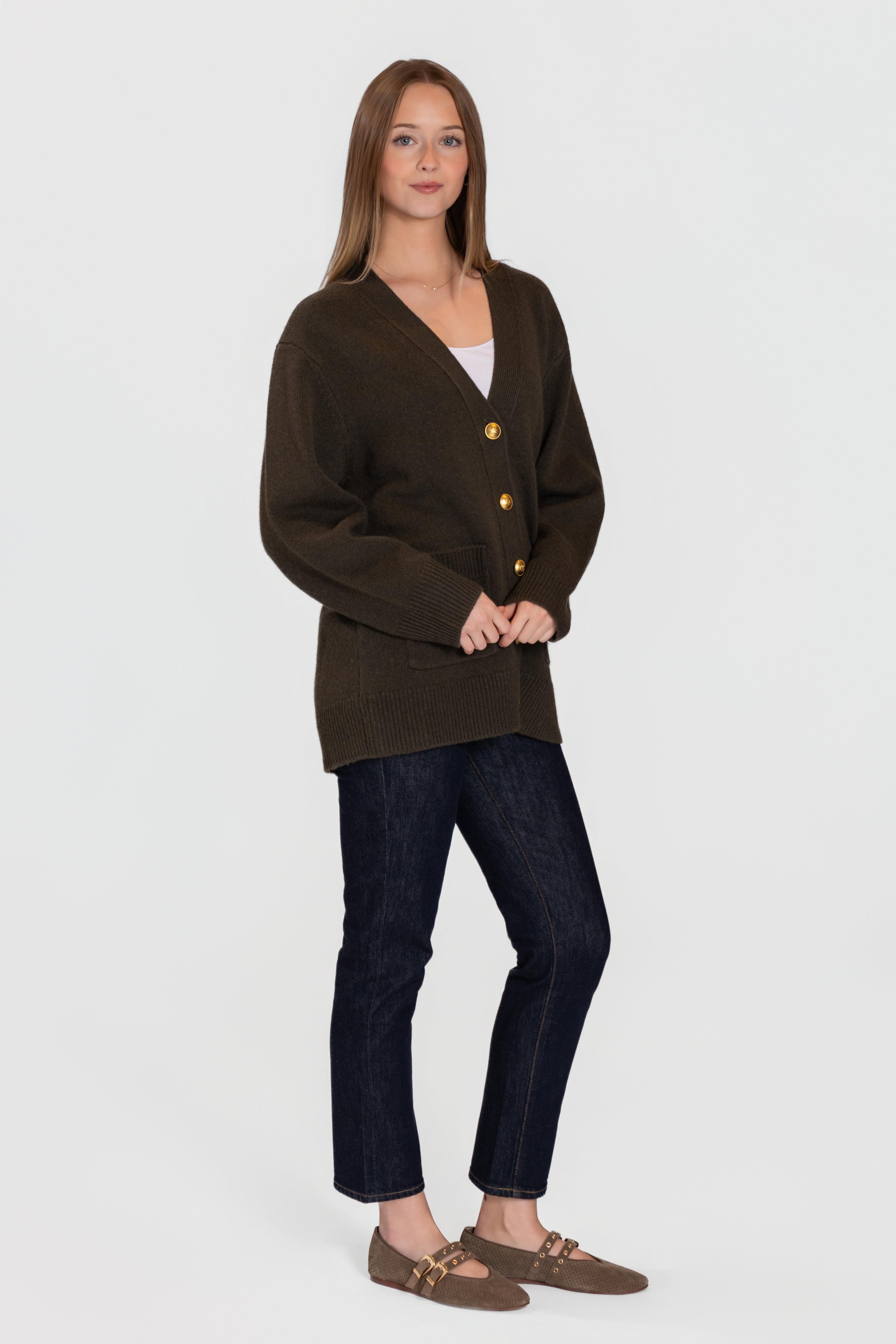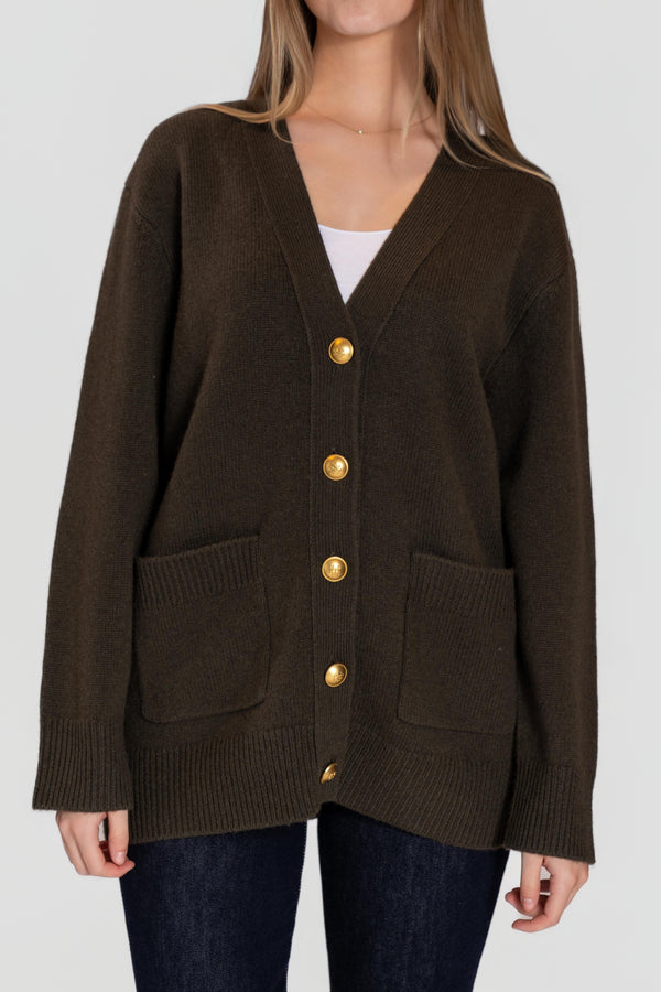 Wrap yourself in timeless comfort with this classic wool cardigan. Crafted from premium, soft wool, it offers cozy warmth with a refined, structured drape. The deep V-neckline and relaxed silhouette make it perfect for layering over tees or blouses, while the bold gold-tone buttons add a touch of understated luxury.
